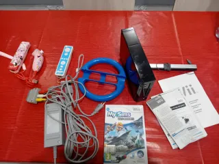 Console Nintendo Wii di colore nero, completa di tutti i cavi necessari per il funzionamento. - Console Wii - Volante da corsa blu - Controller Wii fi minny - Nunchuk di munny - Cavi di collegamento - Gioco My Sims -1controller bianco funzionano solo i tasti