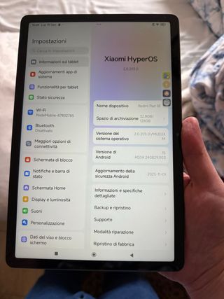 Tablet Xiaomi Redmi Pad SE. - Sistema operativo HyperOS 2.0.203.0. - Versione Android 15. - Aggiornamento sicurezza Android 2025-11-01. Condizioni pari al nuovo. Compreso di scatola originale e custodia.