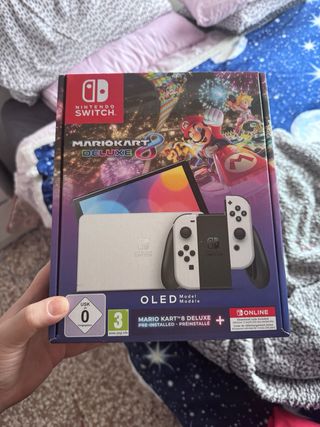 Console Nintendo Switch OLED con Mario Kart 8 Deluxe preinstallato. Acquistata a Natale 2024 e tenuta maniacalmente. - Colore: Bianco e Grigio. - Schermo OLED da 7 pollici. - Memoria interna da 64 GB.