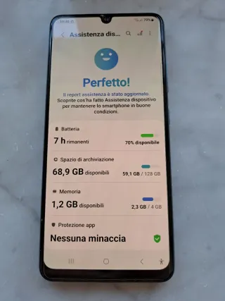 Smartphone Samsung con 128 GB di spazio di archiviazione. - 68,9 GB disponibili per lo spazio di archiviazione. - 1,2 GB di memoria disponibili. - Protezione app: Nessuna minaccia.