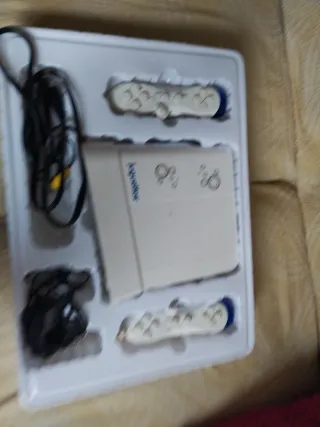 Console per videogiochi classica. - Design iconico in beige. - Include pulsanti di accensione/spegnimento e riavvio.