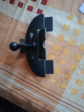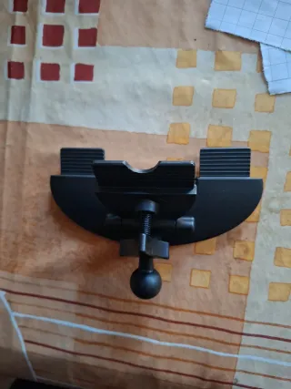 Supporto universale nero per telefono o tablet. - Base semicircolare. - Morsetto regolabile con vite. - Snodo sferico per orientamento.