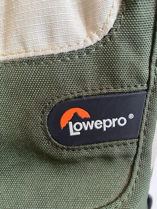 Borsa a tracolla Lowepro, ideale per trasportare un macbook 13 pollici - Colore verde e beige. - Dettagli arancioni. - Tracolla regolabile.