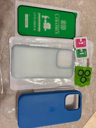 Kit per iPhone 15 Pro, include una cover in silicone blu e una pellicola protettiva in ceramica. - Cover in silicone blu - Pellicola protettiva in ceramica - Protezione per fotocamera