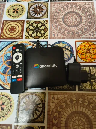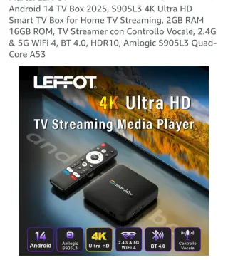 TV Box LEFFOT con Android 14, ideal para streaming en casa. Incluye control remoto y fuente de alimentación. - Procesador Amlogic S905L3 Quad-Core. - Conectividad Wi-Fi 2.4G & 5G y Bluetooth 4.0. - Soporte para resolución 4K Ultra HD y HDR10. - Control por voz.
