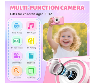 Macchina fotografica istantanea per bambini, perfetta per i più piccoli. Include accessori per stimolare la creatività. - Stampa foto istantanee. - Include cavo USB, scheda SD da 32 GB, 5 rotoli di carta termica e 6 pennarelli colorati.