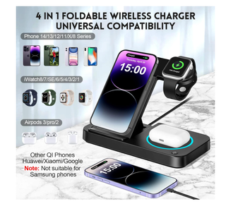 Stazione di ricarica wireless 3 in 1, ideale per caricare più dispositivi contemporaneamente. Design elegante e compatto.Vendo Stazione di ricarica wireless 3 in uno 15 watt per telefono + orologio + cuffie. La stazione di ricarica permette di ricare contemporaneamente 3 dispositivi . 1 smartphone, 1 orologio e 1 cuffia . Nuovo con scatola e accessori. La stazione ha già il Caricatore da 18w con il cavo quindi già pronta all'uso. Il telefono carica a induzione con tecnologia qc 3.0 a 15w . La parte - Potenza di ricarica fino a 15W. - Compatibile con smartphone, smartwatch e auricolari. - Base antiscivolo per una maggiore stabilità.