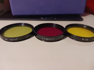 Set di tre lenti colorate per obiettivi fotografici. - Lente gialla con scritta ЖЗ-1.4 e 62x0,75 - Lente rossa con scritta K-8x e 58x0,75 - Lente gialla con scritta M 58