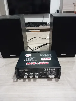 Sistema audio composto da amplificatore e due casse. Casse potenza 30Watt - Amplificatore con ingresso DC/AC. - Lettore MP3 digitale integrato. - Connessione Bluetooth. Con USB - Potenza 300W+300W.