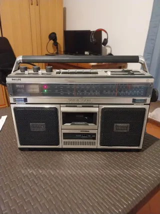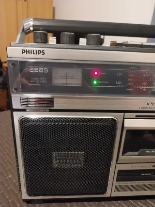 Radio registratore Philips modello 8589 anno 1982. 4 bande OM, OC, OL e FM Dotata di riproduttore di musicassette e registratore. La radio si trova in perfette condizioni, è stata testata ed è funzionante. Per quanto riguarda il riproduttore di cassette non è bloccato ma il motorino non funziona correttamente ed è da rivedere. Qualche piccolo segno del tempo e dell'uso. Funziona con 6 pile da 1,5v non incluse o cavo collegato alla rete in dotazione. Dimensioni 41x24x22 cm peso 4.4 kg. Vendo nello stato in cui si trova con la formula vista e piaciuta.
