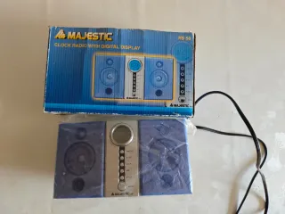 Radiosveglia Majestic RS 58 con display digitale. Unisce le funzioni di radio e sveglia in un unico dispositivo compatto. - Design moderno con finiture blu e argento. - Display digitale per una facile lettura dell'ora. - Alimentazione a corrente e batteria 9v