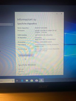 PC portatile Acer con sistema operativo Windows 10 Home. - Processore Intel Core i5-3210M. - RAM installata: 4 GB. - Archiviazione: 256 GB HDD. - Schermo: 15.6 pollici. - Connessioni: USB, HDMI, Wi-Fi. - Batteria: Durata da verificare.