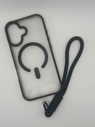 Cover trasparente per iPhone 16 con anello magnetico integrato e laccio. - Design trasparente. - Compatibile con ricarica magnetica. - Laccio da polso incluso.