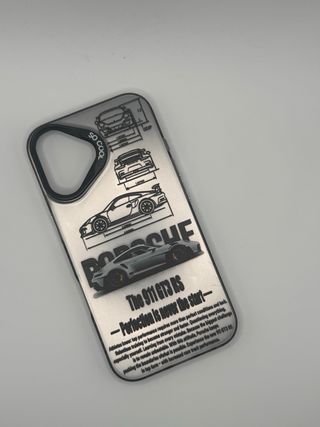 Cover per iPhone con design ispirato alla Porsche 911 GT3 RS. - Grafica dettagliata con disegni tecnici dell'auto. - Citazione Perfection is never the start-. - Immagine della Porsche 911 GT3 RS.