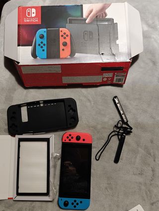 Console Nintendo Switch V1. - pellicola protettiva schermo e guaina in gomma proteggi console cavo HDMI , alimentatore - Joy-Con blu e rossi inclusi. - Schermo touch screen.