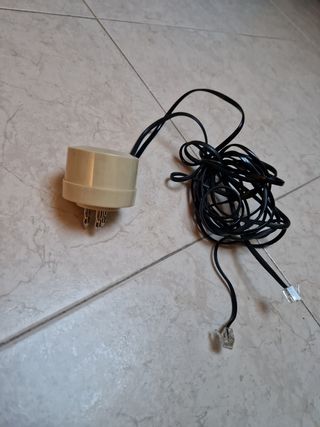 Cavo telefonico con presa di colore beige e cavo nero. - Presa telefonica con tre fori. - Cavo nero lungo.