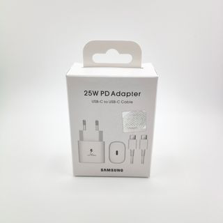Caricatore Samsung 25W PD con cavo USB-C. - Potenza di 25W. - Tecnologia PD (Power Delivery). - Cavo USB-C a USB-C incluso. - Design compatto.