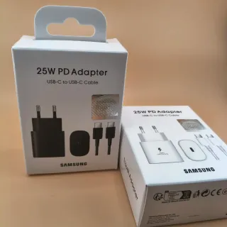 2 Caricatori Samsung 25W PD Adapter con cavo USB-C. - Colore bianco + nero. - Cavo USB-C a USB-C incluso. - Adattatore di corrente. - Super Fast Charging.