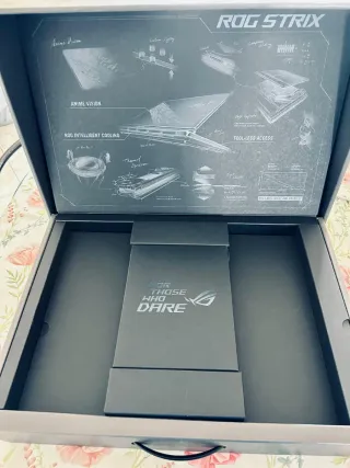 Scatola Originale ASUS ROG Strix Scar 18 2025 - Perfette Condizioni, Solo Packaging! Cofanetto premium con illustrazioni stampate sul coperchio interno (AniMe Vision, ROG Intelligent Cooling, tool-less access) - NESSUN LED o luci reali, solo grafiche semitrasparenti di alta qualità per un effetto visivo. Include slogan iconici “Gamers On” e “For Those Who Dare”. Dimensioni 49x36x10.5 cm, ideale per collezionisti ROG, reshipping o display gaming setup. Dettagli: • Manuali e brochure originali inclusi. • Perfetta per fan ROG Strix Scar series.