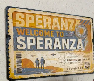 Targa decorativa ispirata al gioco Arc Raiders. Presenta un design retrò con elementi grafici futuristici. - Grafica a tema spaziale. - Bordi stilizzati come un francobollo.