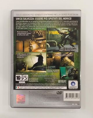 Gioco per PlayStation 2, Tom Clancy's Splinter Cell Chaos Theory in lingua italiana. Il gioco si presenta in buone condizioni generali, la custodia risulta ottimo stato, il disco presenta imperfezioni sulla superfice che non pregiudicano comunque il corretto funzionamento del gioco. Edizione Platinum.