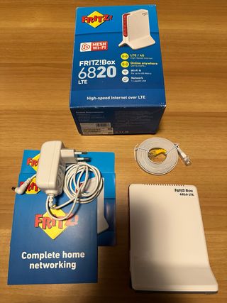 Modem Fritz!Box 6820 LTE per internet ad alta velocità. - Supporto LTE/4G. - Connessione Wi-Fi N fino a 450 Mbit/s. - Porta Gigabit LAN. - Include alimentatore e cavo di rete.