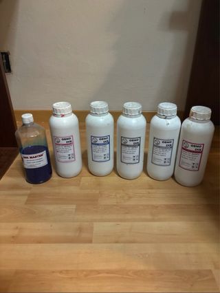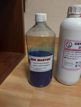 Set di sei flaconi di inchiostro. - Un flacone di inchiostro blu INK MASTER. - Cinque flaconi di inchiostro epson per stampante . SONO INIZIATI