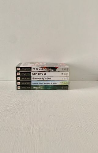 Lotto composto da 5 giochi per playstation portable, tutti nelle confezioni originali e con i rispettivi libretti e umd privi di difetti e perfettamente funzionanti. I giochi sono : f1 grand prix ; nba live 06 ; boog & Elliot a caccia di amici ; everybody's golf ; Eragon. vendo anche singolarmente. L'unico difetto è nella custodia di NBA LIVE 06 come mostrato in foto.