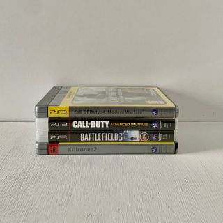 lotto di 4 giochi sparatutto perfettamente funzionanti per playstation 3: Call of Duty 4 :modern warfare platinum; Call of Duty advanced warfare; killzone 2 platinum; battlefield 3.