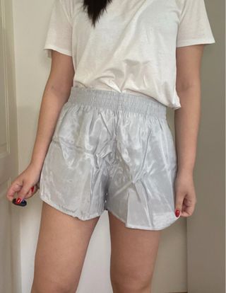 Pantaloncini corti con un elegante effetto argentato. La vita è elasticizzata per un comfort ottimale. - Tessuto leggero e brillante. - Vita elasticizzata. - Design a tinta unita.