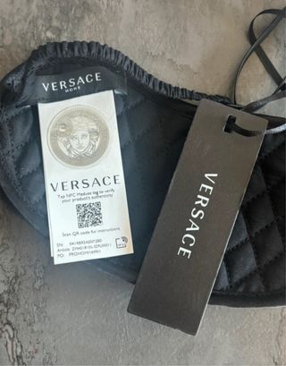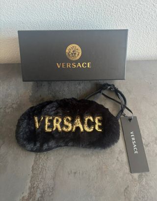 VERSACE MASCHERA PER OCCHI IN ECO PELLICCIA CON LOGO IN PAILLETTES dorato. Nuovo con cartellino. - Logo Versace dorato. - Materiale morbido e peloso.