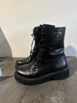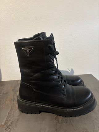 Anfibi Laura Biagiotti in pelle nera numero 37 pari al nuovo, pagati 160€ su yoox. - Logo Laura Biagiotti sul gambale. - Chiusura con lacci. - Suola platform. - Dettaglio logo triangolare sul gambale.