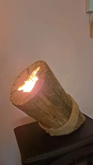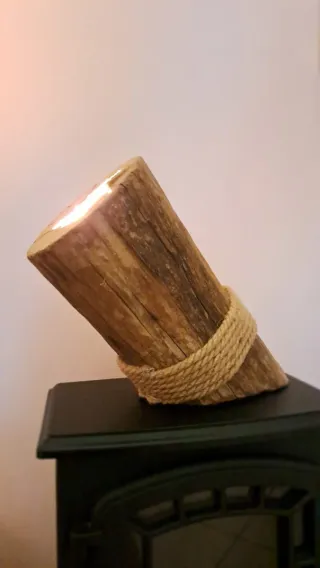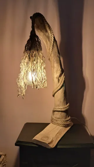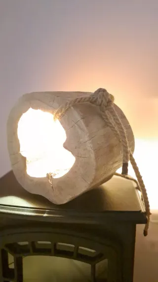 Lampada di design artigianale realizzata con un pezzo unico di legno, rifinita con corda. - Design rustico e originale. - Materiali naturali.
