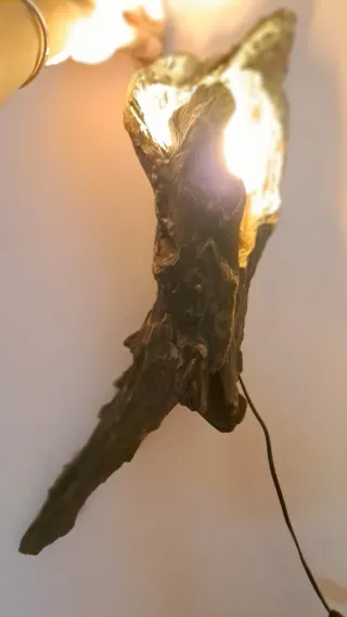 Lampada da parete unica, realizzata con un pezzo di legno naturale. La sua forma irregolare e le venature del legno creano un effetto scenografico. - Design organico e scultoreo. - Illuminazione d'atmosfera. - fornito di interruttore e spina a parete ma di facile applicazione a connettori elettrici a muro.