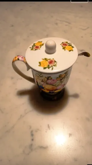 Elegante tazza tisaniera con un delicato motivo floreale. Perfetta per godersi una pausa rilassante. - Design floreale multicolore su base bianca. - Realizzata in ceramica e porcellana.