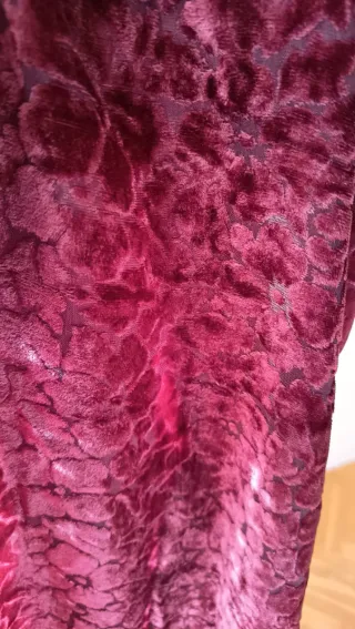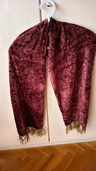 Elegante sciarpa in velluto colore borgona scuro con un motivo decorativo a fiori e frange dorate alle estremità con guanti abbinati in velluto.Perfetti per aggiungere un tocco di classe al tuo outfit.Misure cm 32x148 - Materiale: velluto - Dettagli: frange dorate