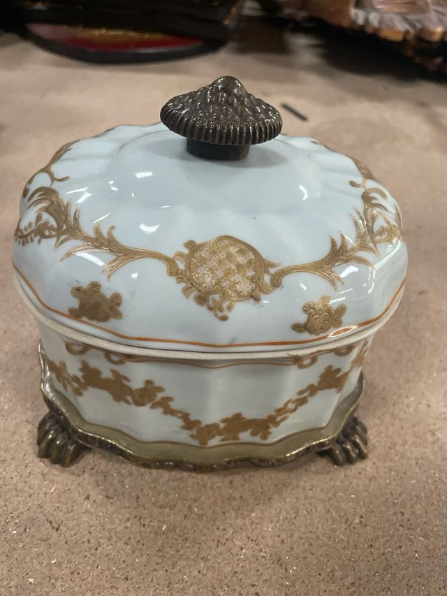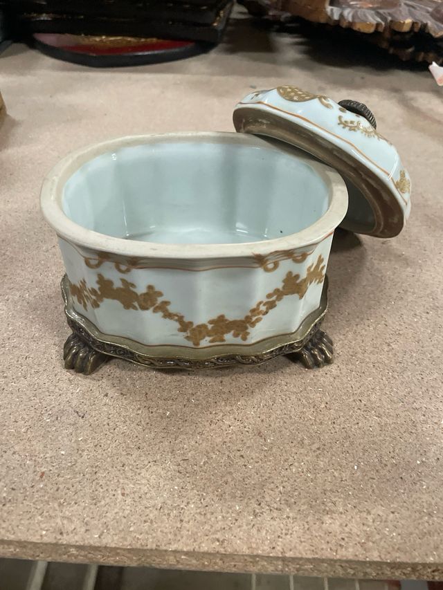 Scatola portagioie vintage in porcellana con base in metallo 15 x 15