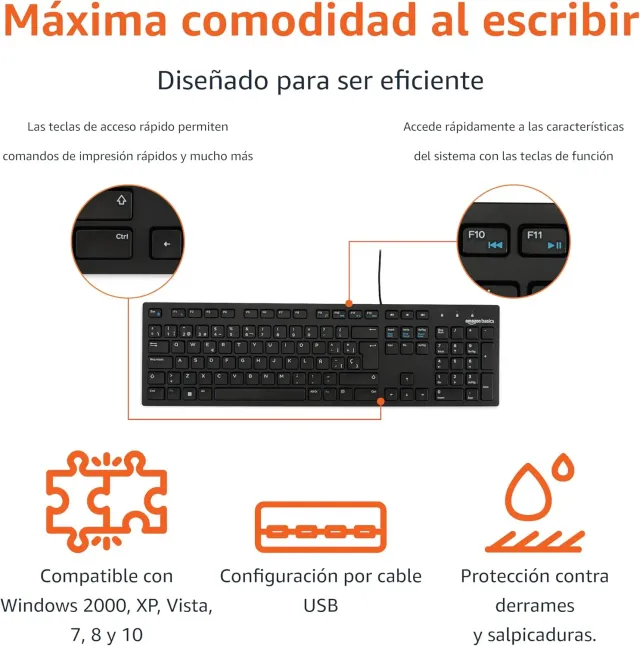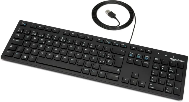 Tastiera con cavo USB Amazon Basics, base sottile, layout spagnolo, nero opaco
