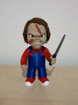 Bambola di Chucky con dettagli iconici. - Vestito con salopette blu e maglia rossa. - Capelli castani e volto con cuciture. - Impugna un coltello.