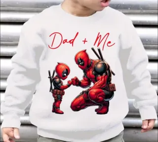 Felpa da bambino con stampa Dad + Me e personaggi di Deadpool. Disponibili tre pezzi Bianca 5/6 anni Nere 3/4-4/5 anni Prezzo rivolto al singolo pezzo - Stampa fronte. - Manica lunga. - Girocollo.