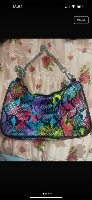 Borsa a tracolla con una vivace fantasia. - Design a squame. - Tracolla a catena. - Chiusura con zip. Vendo borsa Steve Madden animaliè ,nuovissima. Cinturino rimovibile, spazioso scomparso principale, escluso il ciondolo .Materiale interno poliestere , materiale superiore poliuretano. Le misure sono : Cinturino rimovibile: 1 metro Larghezza: 24,5cm Altezza: 15cm Profondità: 7cm
