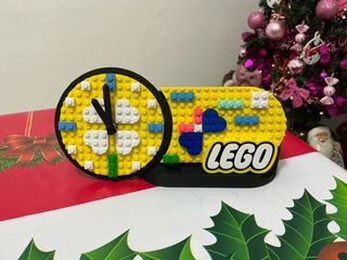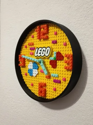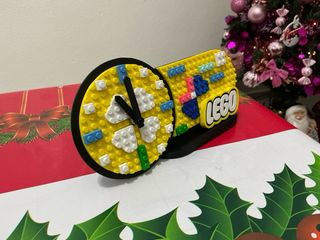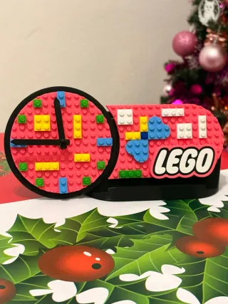 Orologio da tavolo personalizzato con mattoncini simil LEGO. - Diametro 17 cm. - Base nera per il supporto. - Quadrante giallo con logo LEGO. - Dettagli colorati con mattoncini simil LEGO.
