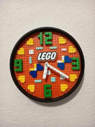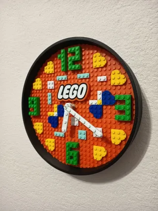 Orologio da parete personalizzato con mattoncini simil LEGO. - Design unico e colorato. - Perfetto per arredare una stanza. - Base arancione. - Numeri e decorazioni in vari colori.
