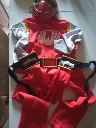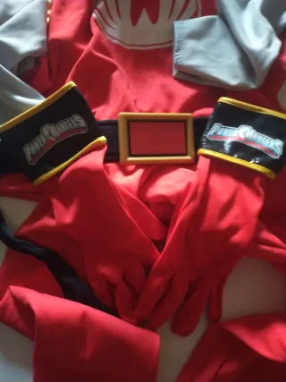 Costume da Power Ranger, un pezzo vintage per rivivere le avventure. - Costume rosso con dettagli grigi e gialli. - Maschera rossa con visiera. - Guanti rossi. - Cintura con fibbia dorata e dettagli neri. - Polsini neri con scritta Power Rangers.