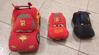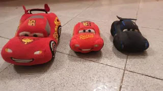 Set di tre morbidi peluche dei personaggi del film Cars. - Peluche di Saetta McQueen rosso. - Peluche di Saetta McQueen rosso più piccolo. - Peluche di un personaggio Cars nero.