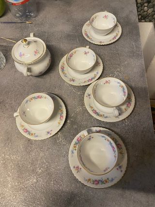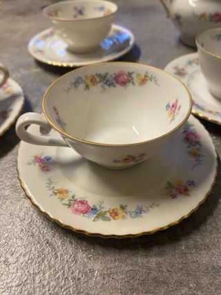 Elegante set da caffè in porcellana con decorazioni floreali. - Tazze e piattini coordinati. - Motivo floreale multicolore. - Bordo dorato.