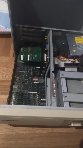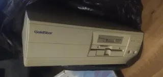 Un computer vintage GoldStar, modello 386sx. - Joystick Schneider - Colore beige. - Design classico da desktop.