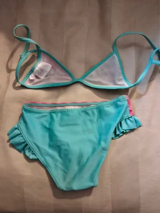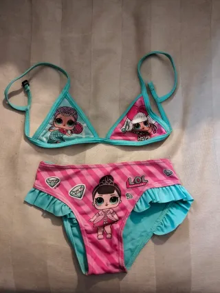 Costume da bagno per bambina con stampa LOL Surprise. - Top a triangolo con spalline regolabili. - Slip con volant e stampa a righe. - Design colorato con personaggi LOL.