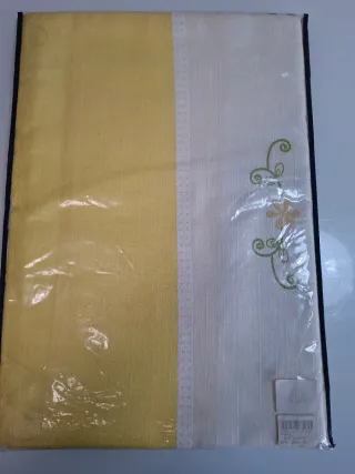 Elegante tovaglia in lino, perfetta per occasioni speciali o per dare un tocco di colore alla tavola. - Dimensioni: 140x240 cm. - Adatta per 12 persone. - Design con bordatura e ricamo floreale.