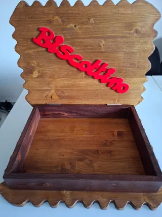 Scatola in legno con una simpatica forma di biscotto, ideale per conservare piccoli oggetti o ricordi. - Materiale: legno - Design: forma di biscotto con bordi ondulati - Finitura: verniciatura effetto legno scuro - Dettagli: presenza di fori sulla superficie